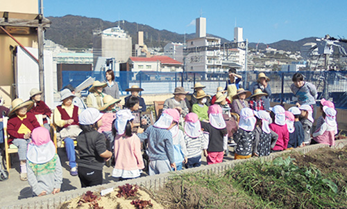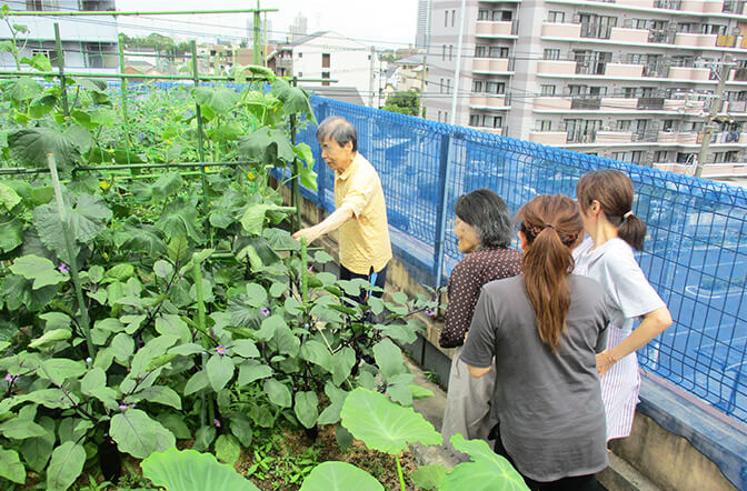 屋上に菜園スペースを設け、野菜の世話から収穫まで入居者と共に行っています。収穫した野菜は完全無農薬、季節感あふれる食材が日々の食卓を彩っています。また、丹波にも農園があり、屋上ではできない本格的な野菜を栽培しており定期的に訪れることが非日常的な時間となり心地よい刺激となっています。