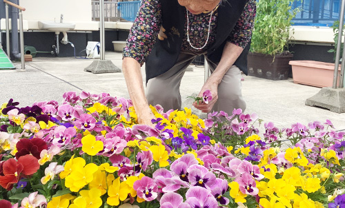 屋上や地下にガーデニングスペースを設け、土作りから花の世話まで入居者と共に行っています。花壇を作ることで季節の花々を楽しみ季節感を味わえることで時間の流れや季節の移り変わりを肌で感じることにより生活の張りや緊張感が心地よい刺激となっています。